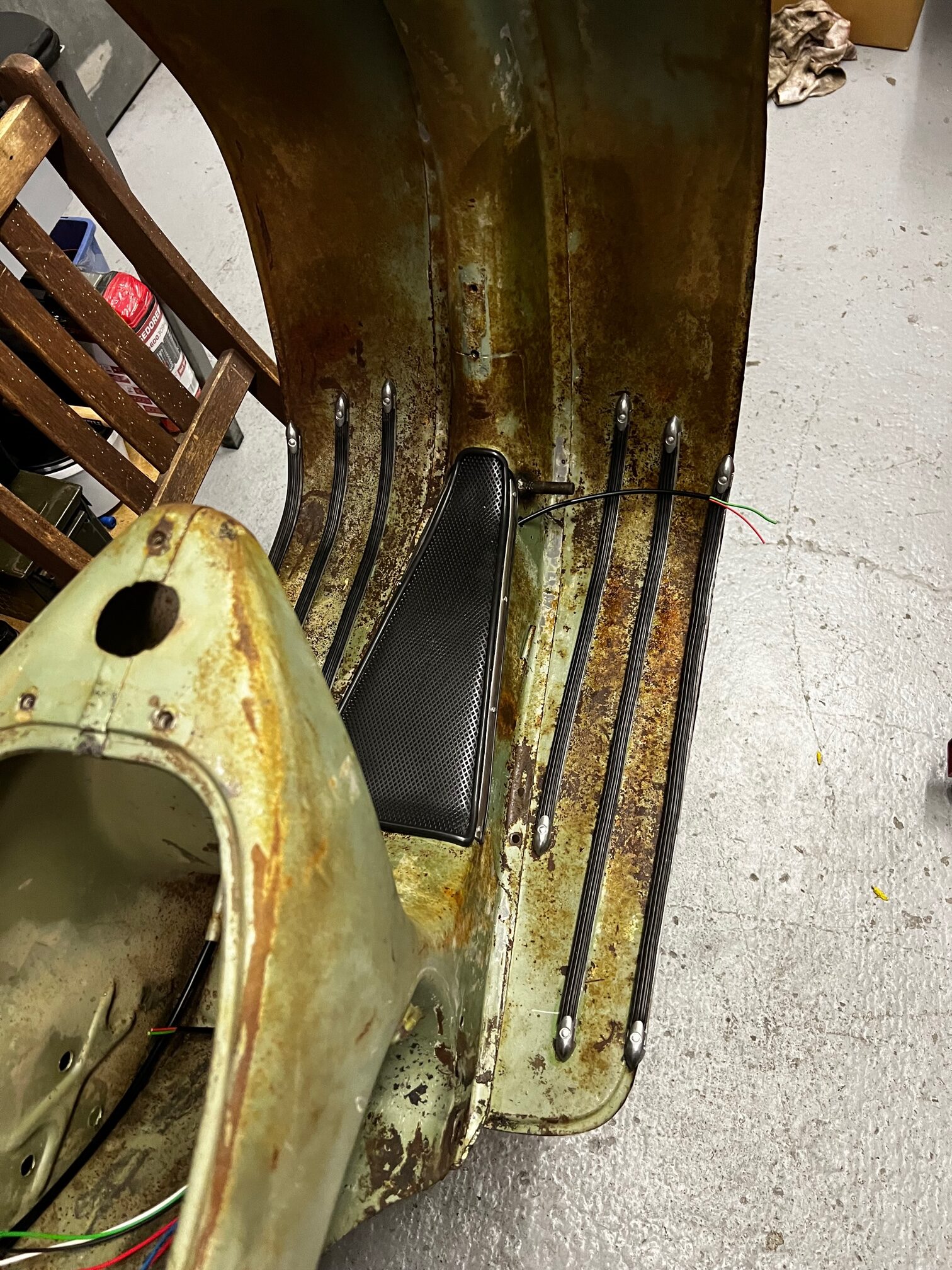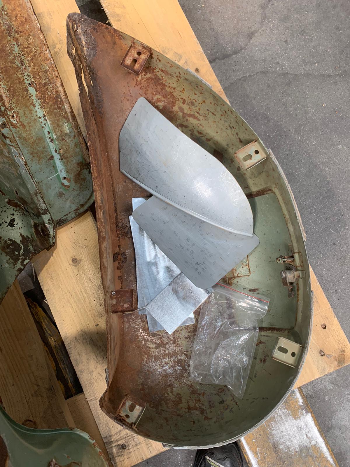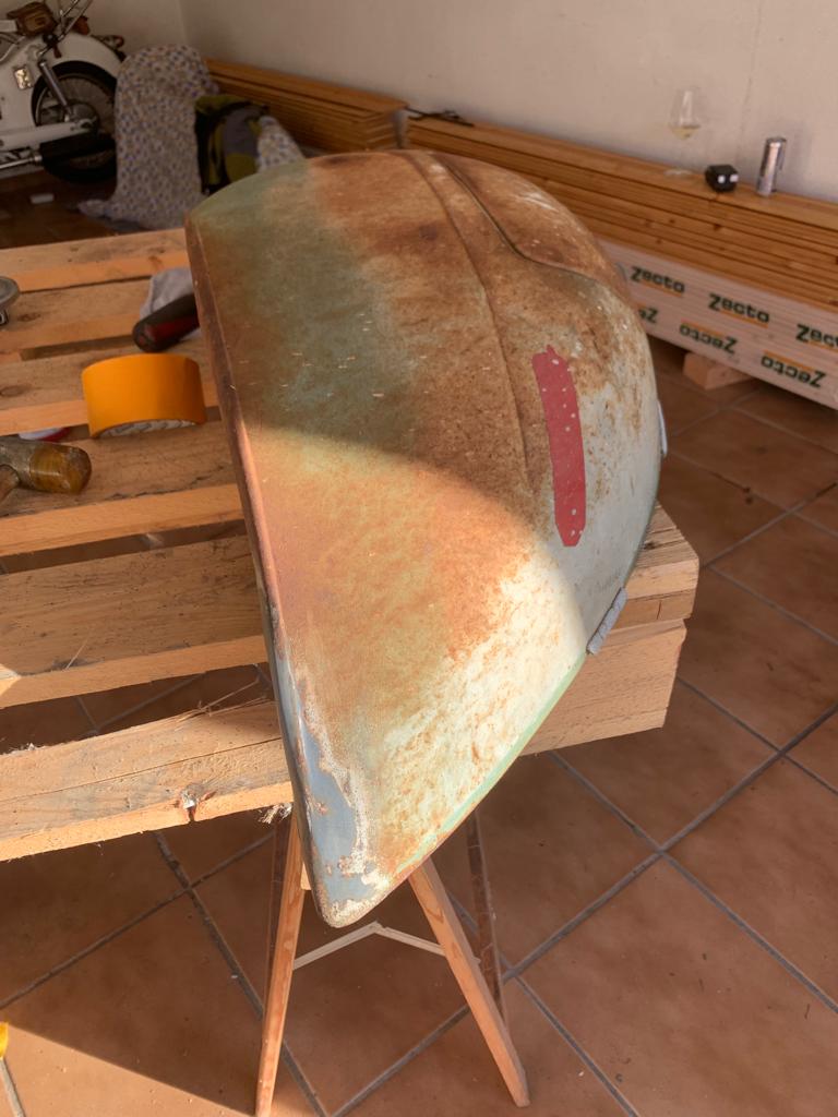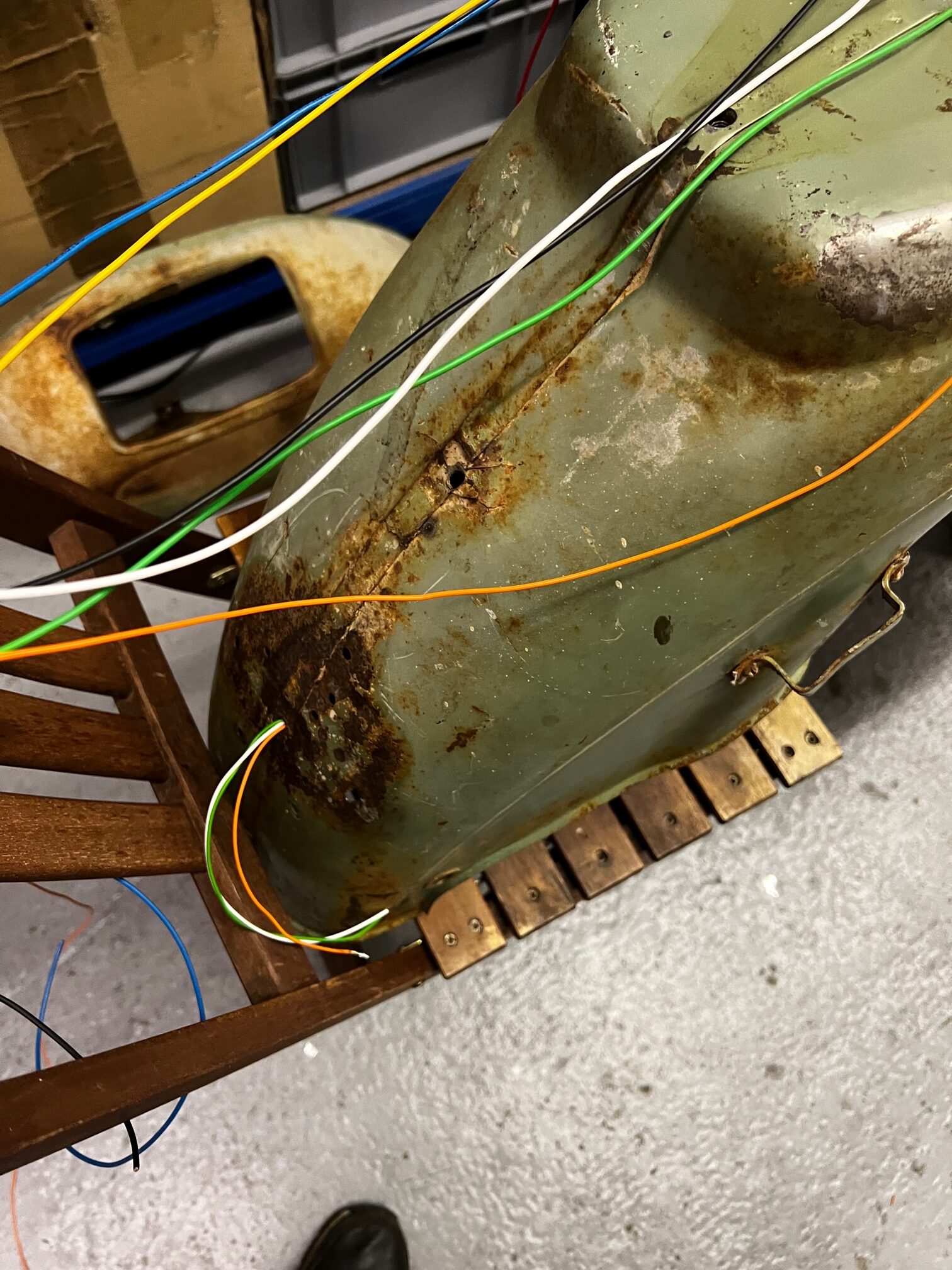 Hier sieht man schön, wie durchgerostet das hintere Eck ist, eh bei fast allen. Meine Nichte wollte nicht schweißen, dass der Rest nicht zu sehr in Mitleidenschaft gezogen wird.