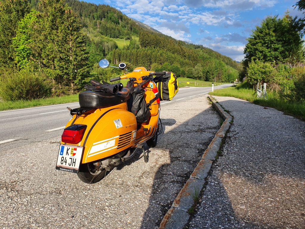 ÖAMTC kam, holte mich ab, brachte den Beiwagen nach Liezen, ich schnappte mir ein Clubmobil und fuhr heim nach Klagenfurt, holte meine Motovespa aus der Garage, packte diese und habe mich entschieden, dass ich erst Freitag starte, ich war erst um ca 21 Uhr zurück.