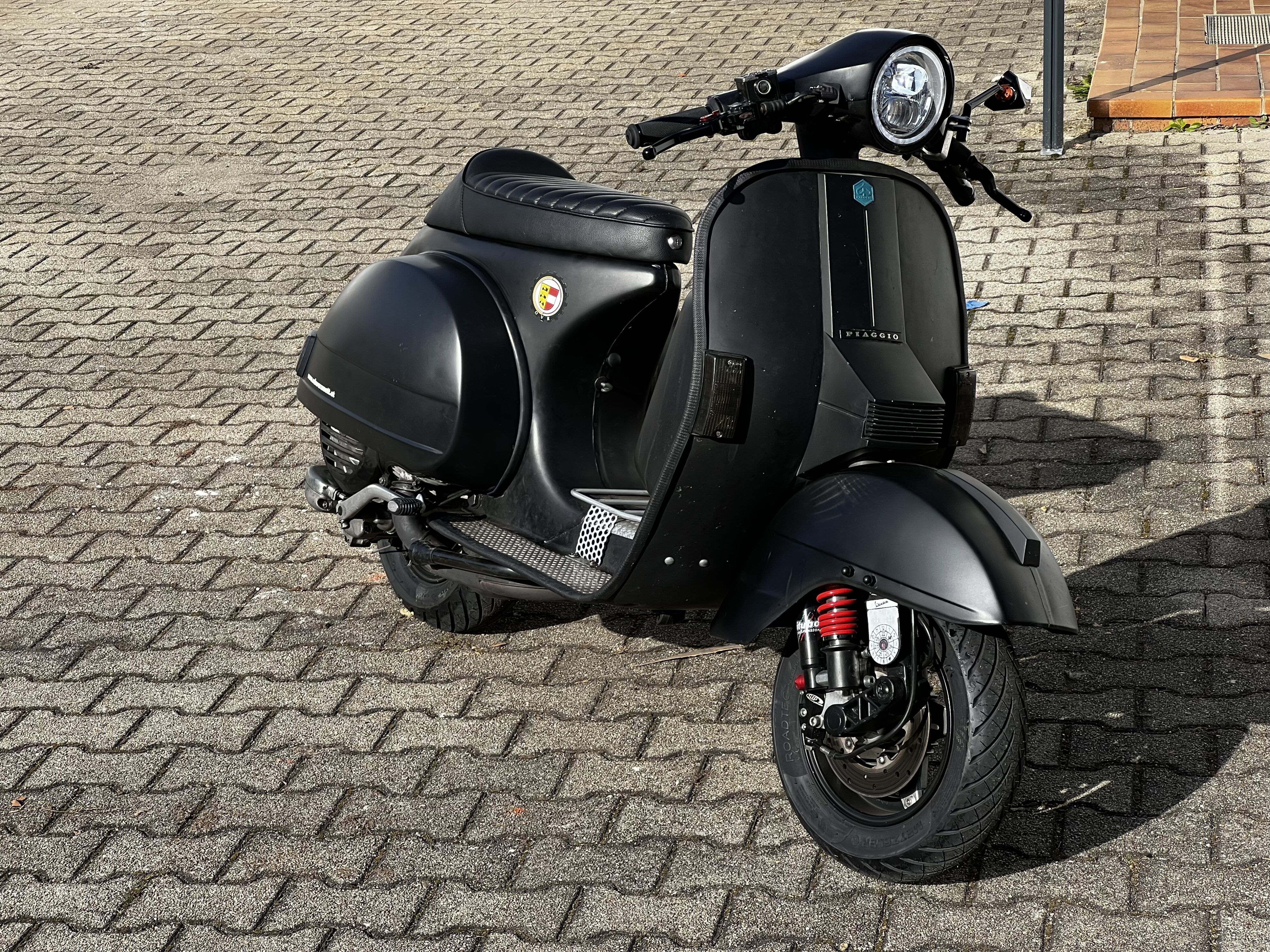 Umgebaut habe ich viel an dem Roller den ich 1991 gekauft habe, da war alles Original inklusive nahezu perfekten OLack. Als erstes war der Motor an der Reihe, 210 Malossi (alt) mit 34 VHSB Vergaser und Membran, selbst geschweißter Reso-Auspuff. Dann kam die Karosserie an die Reihe, schwarzmatt mit der Spraydose lackiert, Drop verbaut, Rückleuchten eingesetzt, und so ging es weiter.